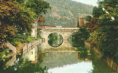 Hand colored post card circa 1910 of the "New Canal Bridge" leading